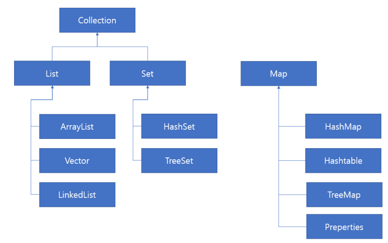 그 인터페이스(컬렉션)으로 구현되어있는 것들이 List, Set, Map인데 이 컬렉션 인터페이스들을 통해 구현한 것들(ArrayList, HashMap 등)을