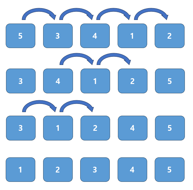 - 예를 들어, 첫 번째와 두 번째를 비교하고 교환하고 두 번째와 세 번째를 비교하여 교환하는 식으로 진행하여 n 번째와 n+1번째 자료를 비교하고 교환하여 정렬을 진행한다.