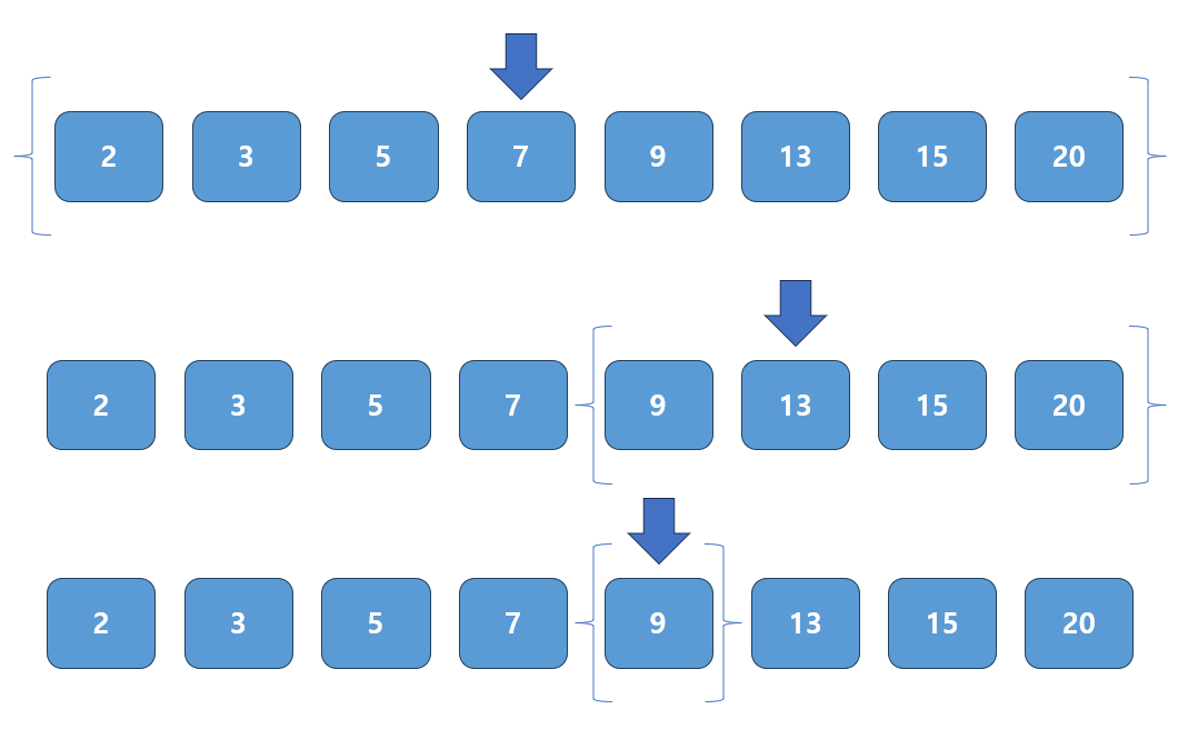 - 예를 들어 살펴보자. ( 2 3 5 7 9 13 15 20, 찾는 값 = 9 )