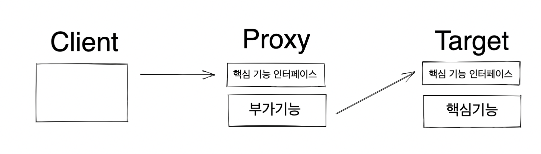 Proxy는 원래 객체를 대신해서 클라이언트의 요청을 받아들이고, 부가기능을 처리하며 타겟을 호출하여 핵심 기능을 실행시키도록 하는 것이다.