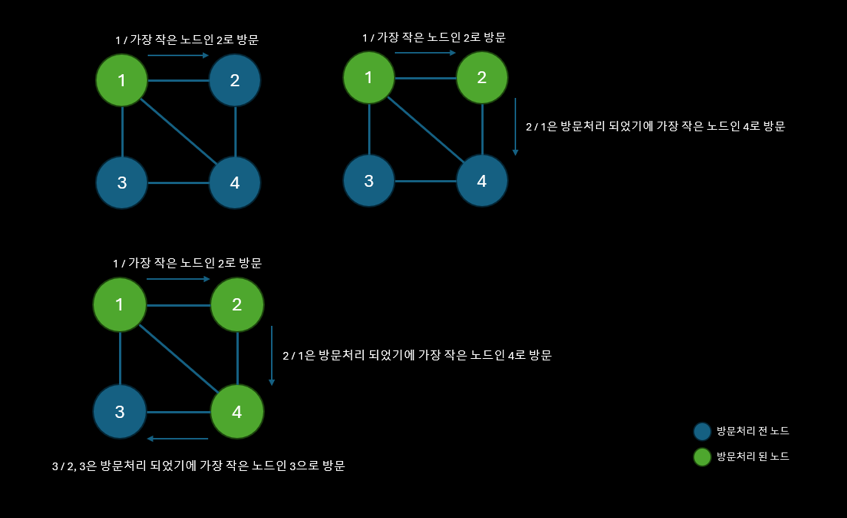 해당 노드에서 갈 수 있는 방향을 기준으로 가장 작은 노드를 선택해서 방문 처리하며 진행한다.