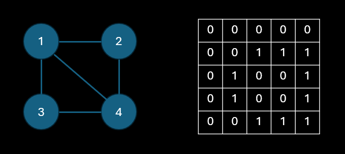 1번 노드의 경우 2, 3, 4번 노드로 이동할 수 있고, 2번은 1, 4번 그리고 3번도 1, 4번 마지막으로 4번은 1, 2, 3번 노드로 이동할 수 있다.