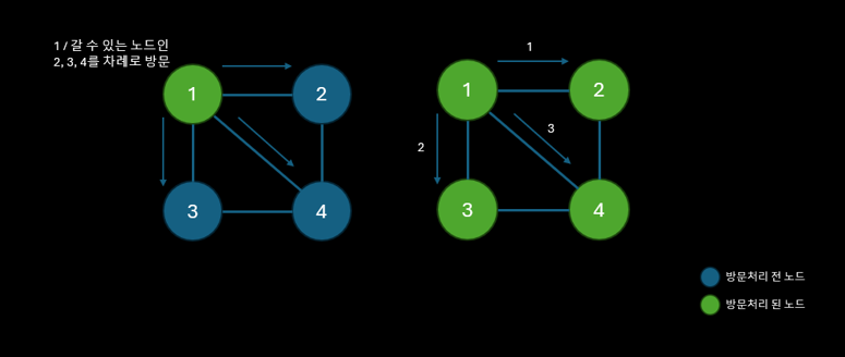 BFS로 위 예제를 탐색하게 되면 1 2 3 4 이라는 결과를 얻을 수 있다.